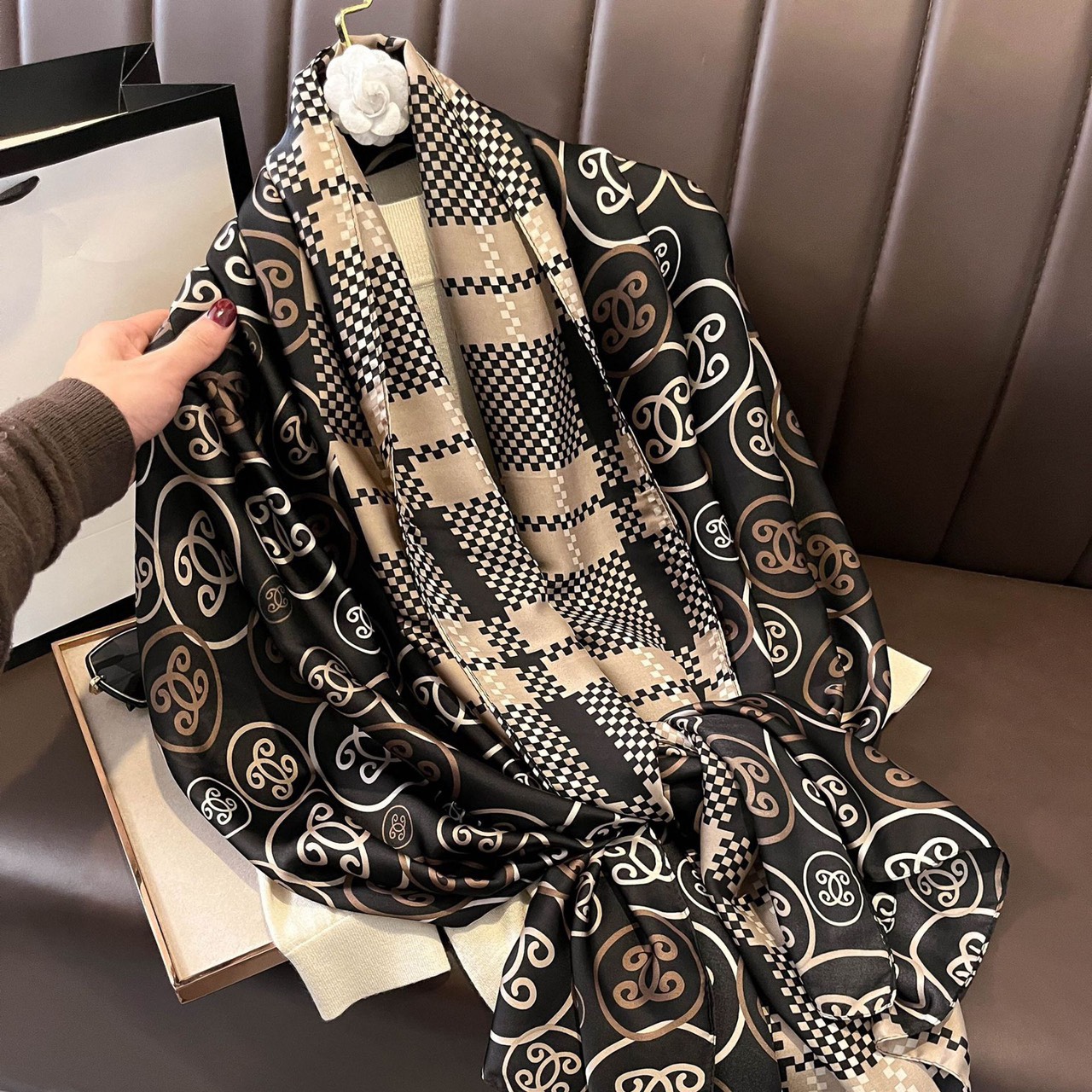 Khăn lụa hoa của Tường Minh Silk được làm từ chất lụa Hàng Châu mềm mượt, mang họa tiết trẻ trung, hiện đại.