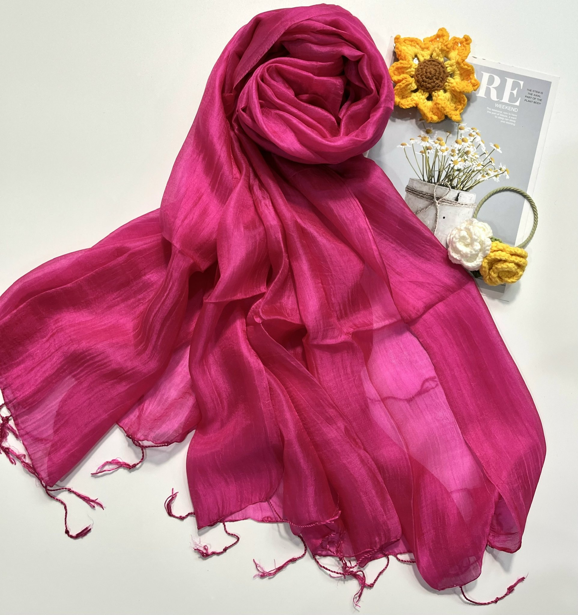 Sự kết hợp giữa tơ dâu tằm và sợi kén vỏ tằm đem đến sự nhẹ nhàng, bay bổng nhưng cũng đủ ấm áp cho những ngày gió lạnh. Tơ tằm được mệnh danh là “làn da thứ 2 của cơ thể con người”. Mẫu khăn tơ tằm màu trắng thanh lịch, dễ dàng phối đồ, tạo kiểu, nhiều màu sắc phù hợp mọi lứa tuổi.