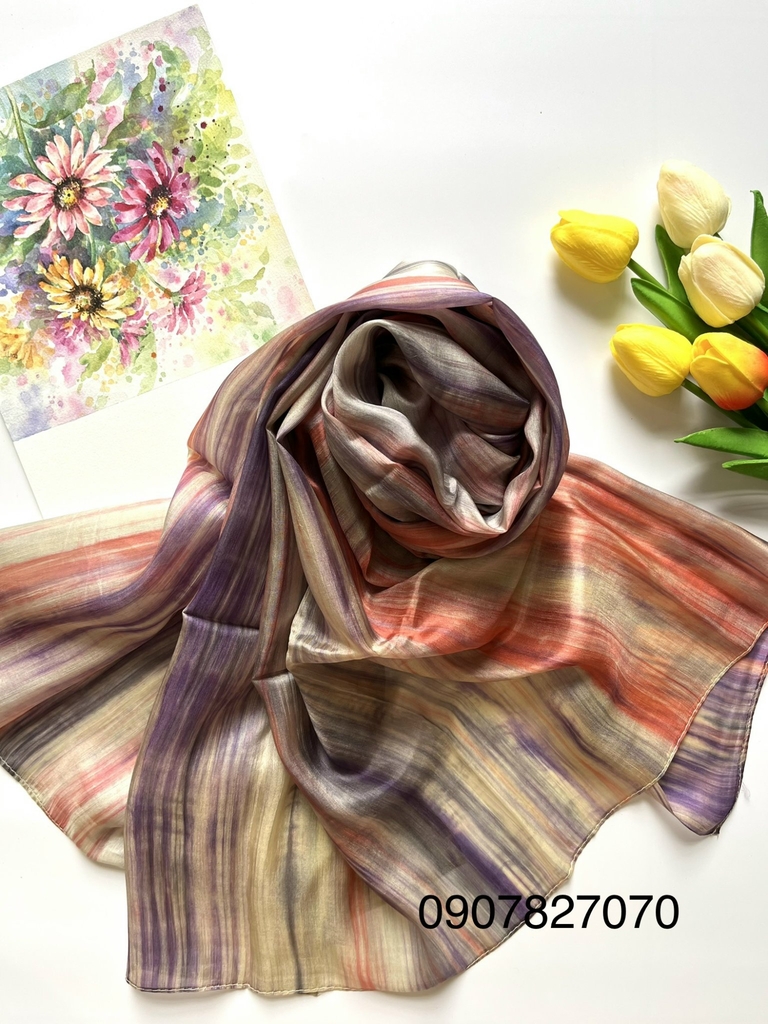 Khác với sự đơn giản, tinh tế của khăn lụa 1 màu, lụa tằm nhuộm loang mang một nét phá cách cực kỳ độc lạ, kết hợp các màu sắc một cách tỉ mỉ, hoà quyện. Không quá sặc sỡ nhưng vẫn đủ để thể hiện cá tính của người đeo. Khăn được dệt từ lụa tơ tằm nên hoàn toàn giữ được những đặc tính cao cấp của lụa: mềm mại, bóng, nhẹ tênh, chỉ cần chạm nhẹ là mê mẩn. Đặc biệt dòng lụa này sẽ đem lại cho bạn cảm giác ấm áp khi diện vào mùa đông và mát mẻ khi mang vào mùa hè.