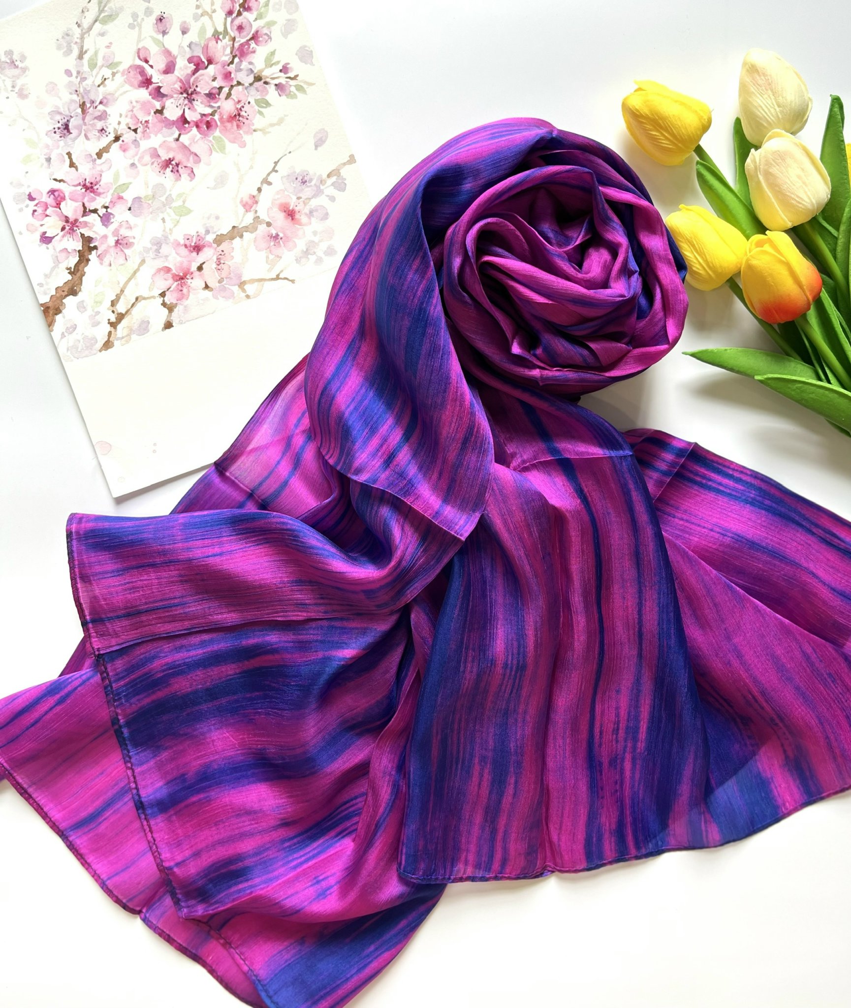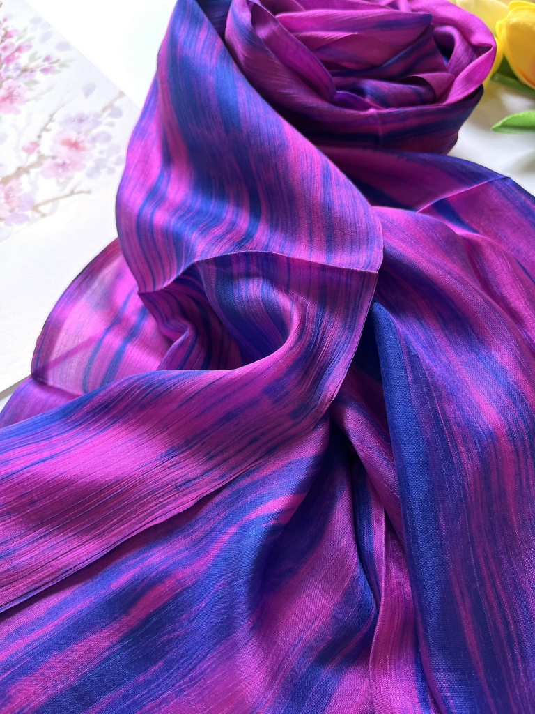 Khác với sự đơn giản, tinh tế của khăn lụa 1 màu, lụa tằm nhuộm loang mang một nét phá cách cực kỳ độc lạ, kết hợp các màu sắc một cách tỉ mỉ, hoà quyện. Không quá sặc sỡ nhưng vẫn đủ để thể hiện cá tính của người đeo. Khăn được dệt từ lụa tơ tằm nên hoàn toàn giữ được những đặc tính cao cấp của lụa: mềm mại, bóng, nhẹ tênh, chỉ cần chạm nhẹ là mê mẩn. Đặc biệt dòng lụa này sẽ đem lại cho bạn cảm giác ấm áp khi diện vào mùa đông và mát mẻ khi mang vào mùa hè.