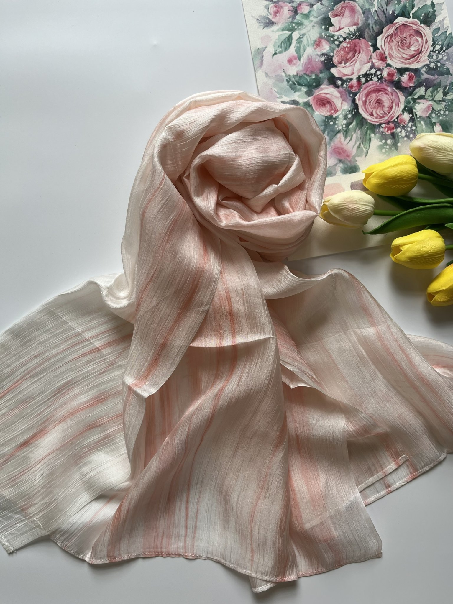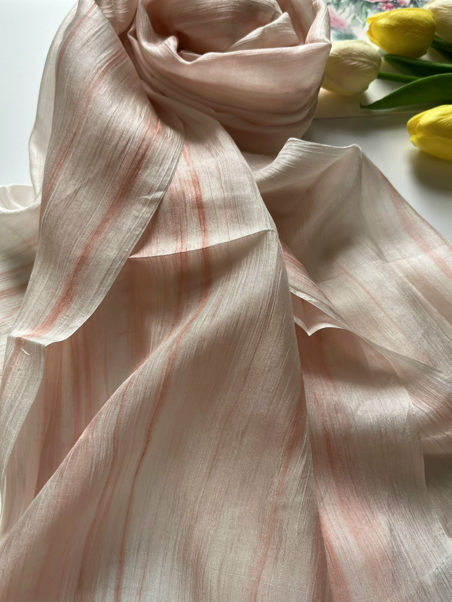 Khăn được dệt từ lụa tơ tằm nên hoàn toàn giữ được những đặc tính cao cấp của lụa: mềm mại, bóng, nhẹ tênh, chỉ cần chạm nhẹ là mê mẩn.