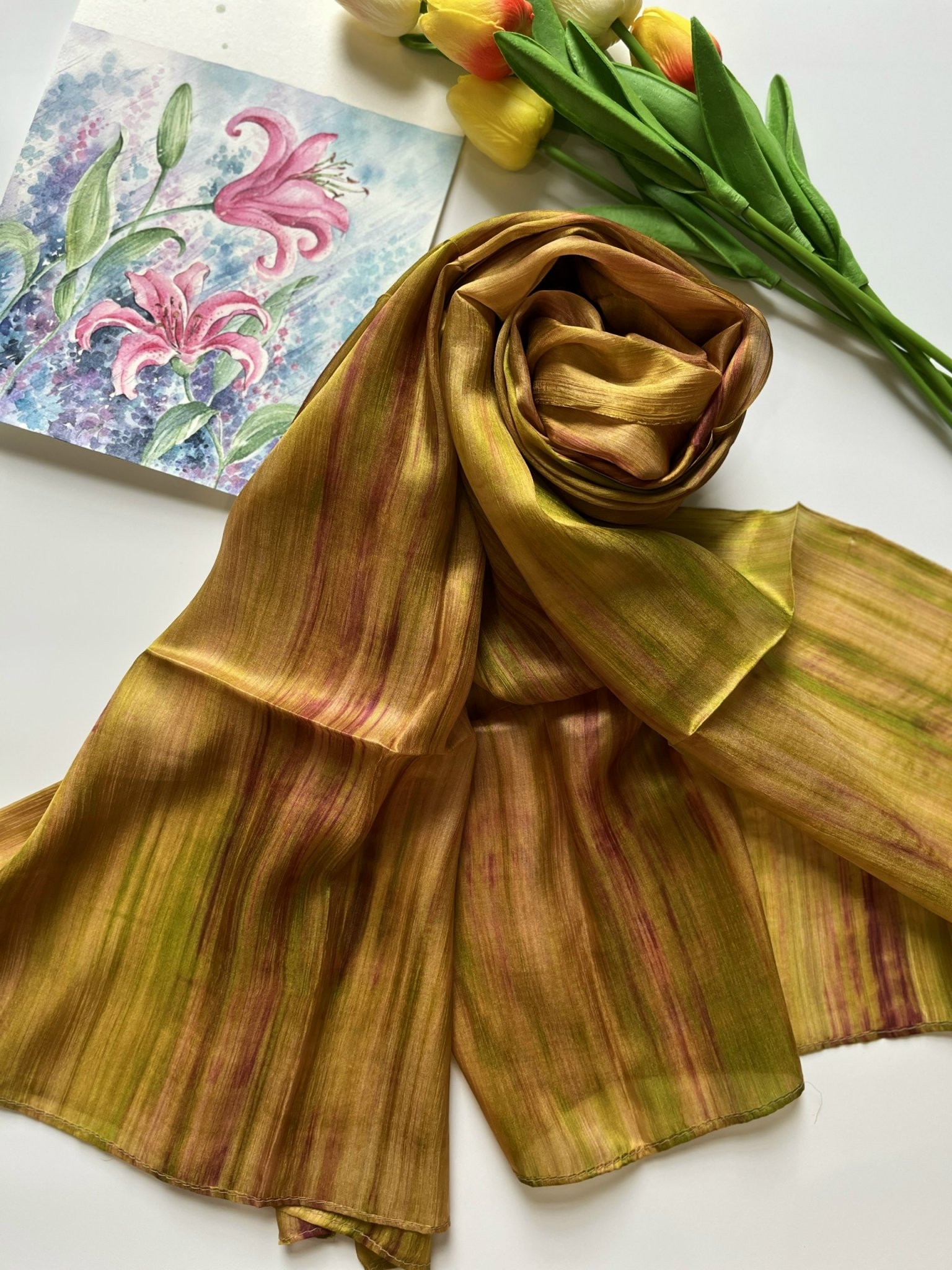 Khác với sự đơn giản, tinh tế của khăn lụa 1 màu, lụa tằm nhuộm loang mang một nét phá cách cực kỳ độc lạ, kết hợp các màu sắc một cách tỉ mỉ, hoà quyện. Không quá sặc sỡ nhưng vẫn đủ để thể hiện cá tính của người đeo. Khăn được dệt từ lụa tơ tằm nên hoàn toàn giữ được những đặc tính cao cấp của lụa: mềm mại, bóng, nhẹ tênh, chỉ cần chạm nhẹ là mê mẩn. Đặc biệt dòng lụa này sẽ đem lại cho bạn cảm giác ấm áp khi diện vào mùa đông và mát mẻ khi mang vào mùa hè.