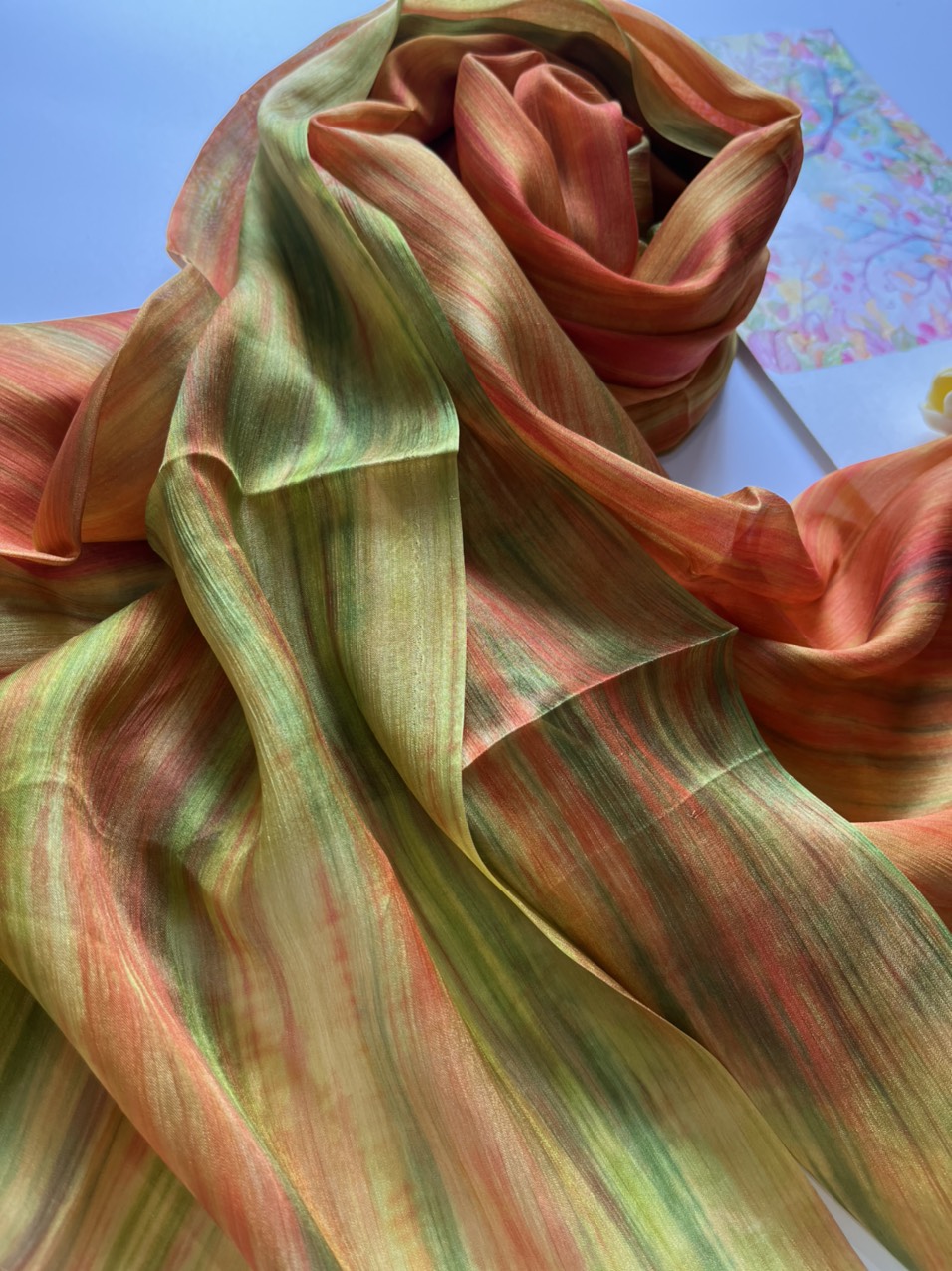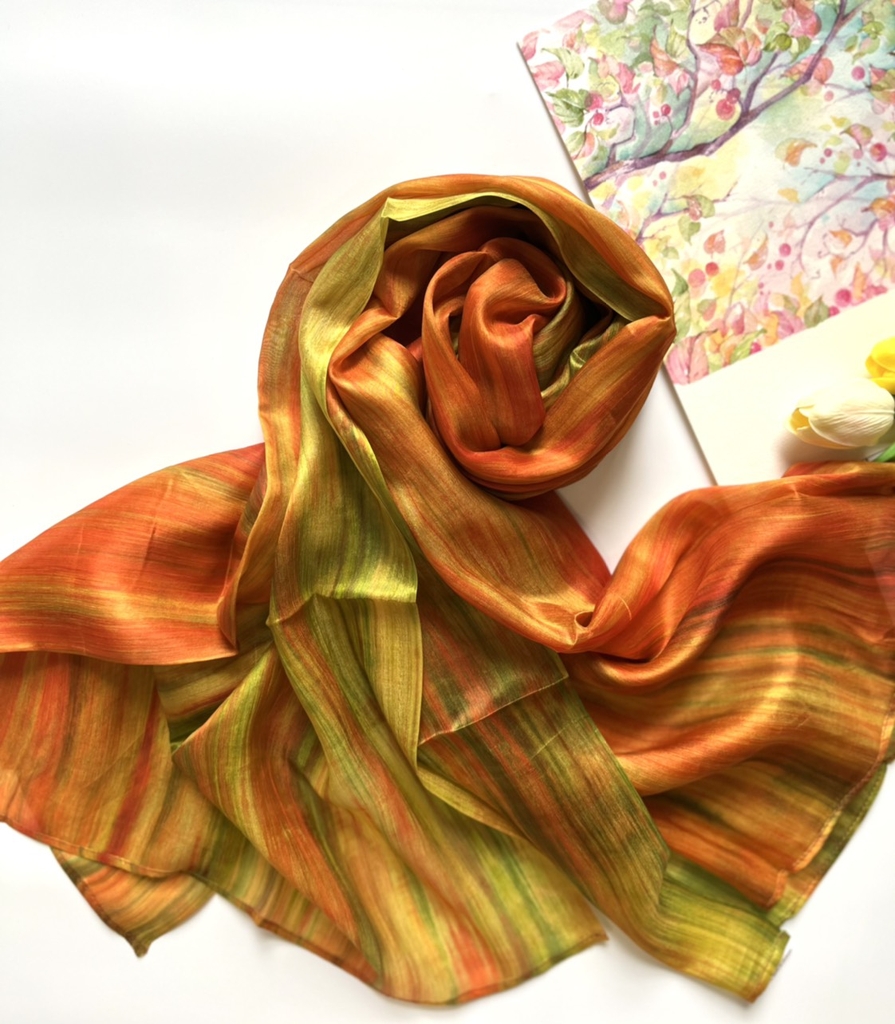 Khác với sự đơn giản, tinh tế của khăn lụa 1 màu, lụa tằm nhuộm loang mang một nét phá cách cực kỳ độc lạ, kết hợp các màu sắc một cách tỉ mỉ, hoà quyện. Không quá sặc sỡ nhưng vẫn đủ để thể hiện cá tính của người đeo. Khăn được dệt từ lụa tơ tằm nên hoàn toàn giữ được những đặc tính cao cấp của lụa: mềm mại, bóng, nhẹ tênh, chỉ cần chạm nhẹ là mê mẩn. Đặc biệt dòng lụa này sẽ đem lại cho bạn cảm giác ấm áp khi diện vào mùa đông và mát mẻ khi mang vào mùa hè.